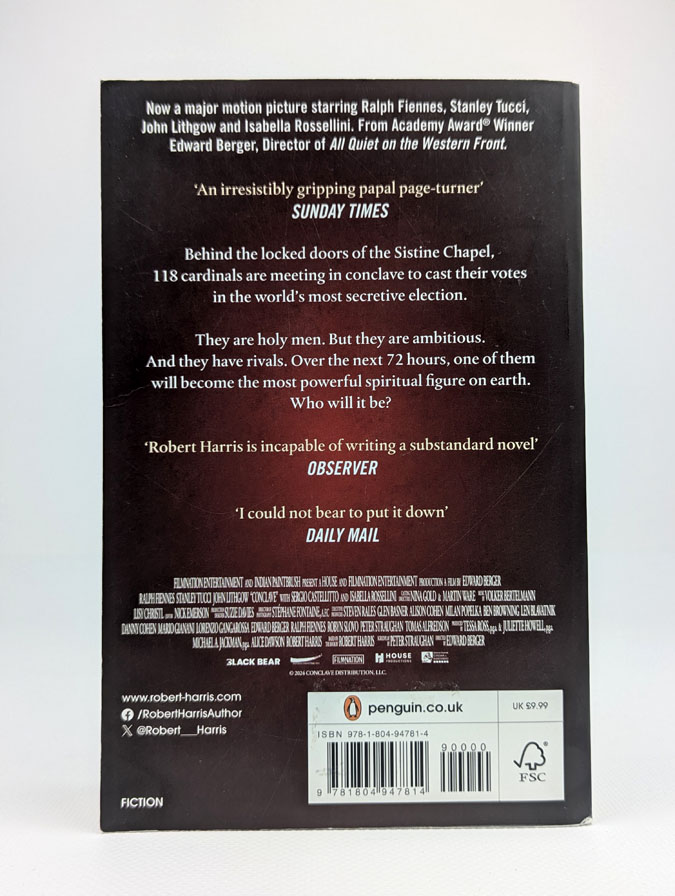 Conclave — напружений політичний трилер Роберта Гарріса, дія якого розгортається у стінах Ватикану. Після смерті Папи кардинали з усього світу збираються на таємне конклавне голосування, щоб обрати нового понтифіка. Але серед них приховано багато амбіцій, страхів і секретів. Коли з’являється загадковий кандидат, рівновага руйнується. Гарріс майстерно поєднує релігійну драму, інтригу та психологічну напругу, створюючи історію про владу, віру й людську слабкість.