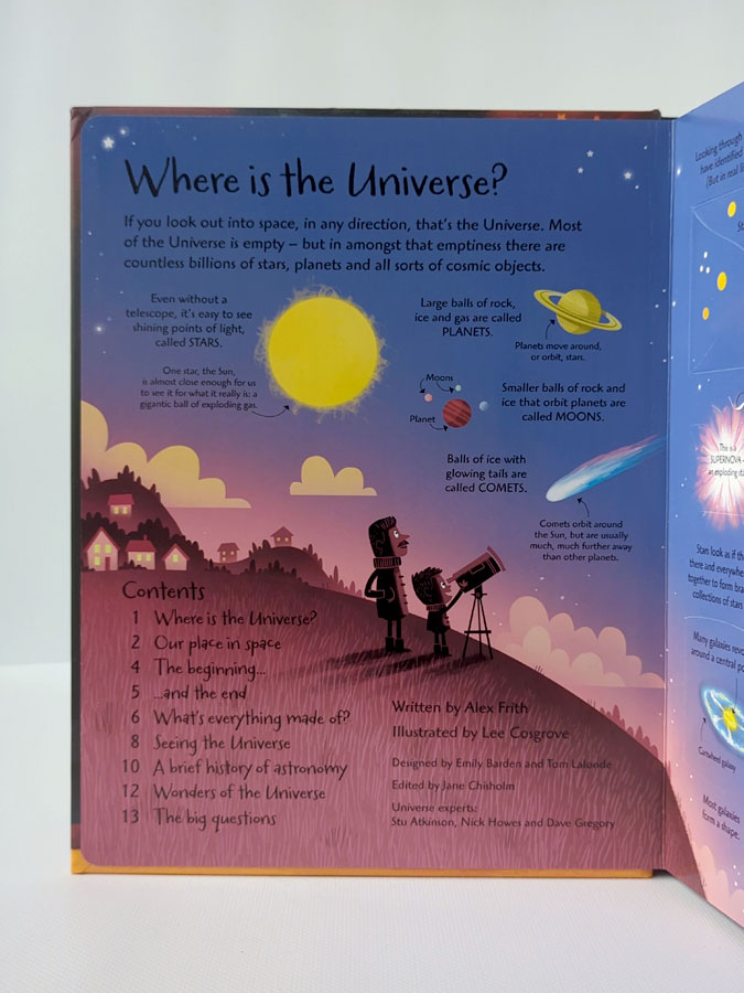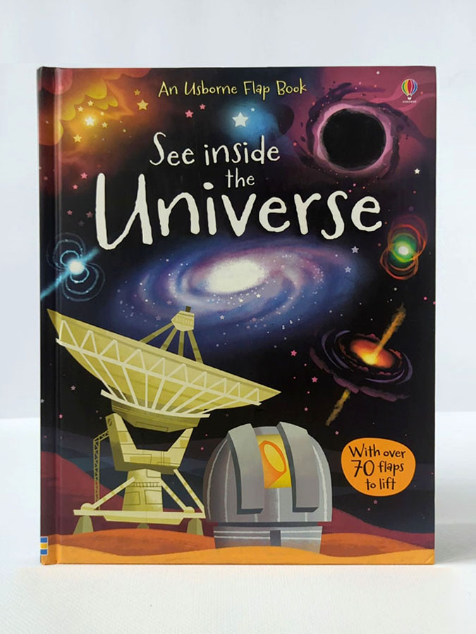 «See Inside the Universe» — пізнавальна книжка з інтерактивними сторінками та понад 70 відкидними клапанами, що відкривають дивовижний світ космосу. Вона пояснює складні речі просто — від Великого вибуху та утворення галактик до життя зірок, чорних дір і майбутнього Всесвіту. Яскраві ілюстрації, наукові факти та цікаві деталі роблять цю книгу захопливою для дітей і дорослих. Це ідеальний подарунок для юних дослідників, які мріють про зорі й хочуть зрозуміти, як працює наш Всесвіт.