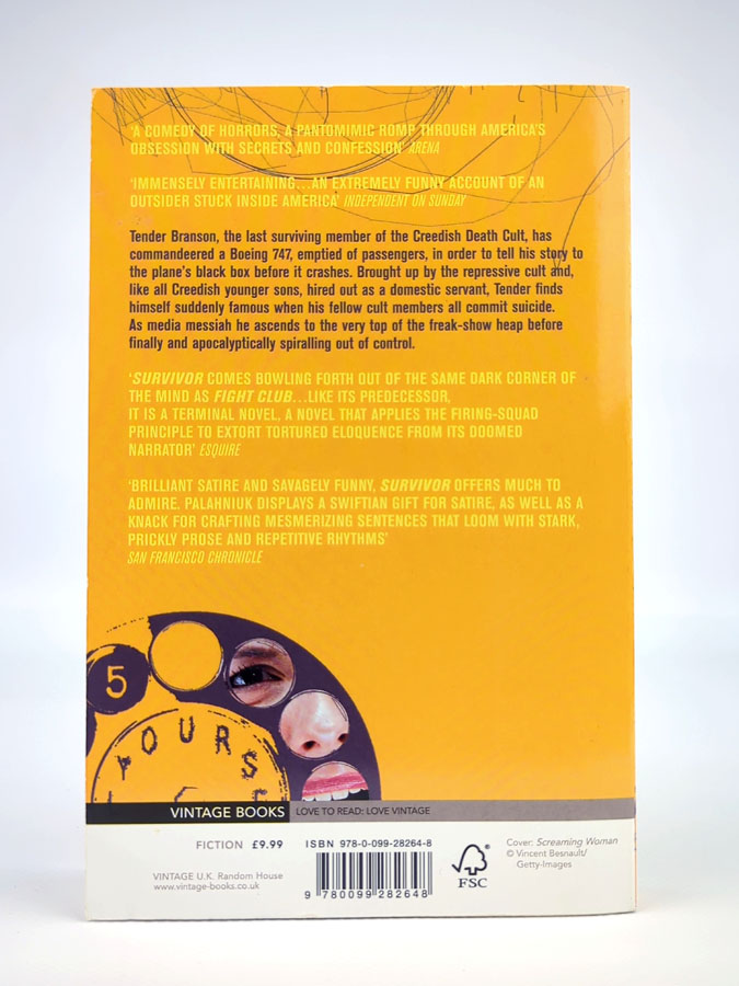 У романі Survivor Чак Паланік розповідає історію Тендера Бренсона – останнього вижившого члена релігійного культу. Перебуваючи на борту літака, що невдовзі має розбитися, він записує власну історію життя: від покірного слуги до медійного месії. Його шлях сповнений абсурду, маніпуляцій і спотвореної слави, а також складних стосунків із Фертіліті Голліс. Книга поєднує чорний гумор із гострою сатирою на сучасне суспільство, культ популярності та духовну порожнечу. Це провокативна й незабутня історія про ідентичність, контроль і межу між вірою та безумством.