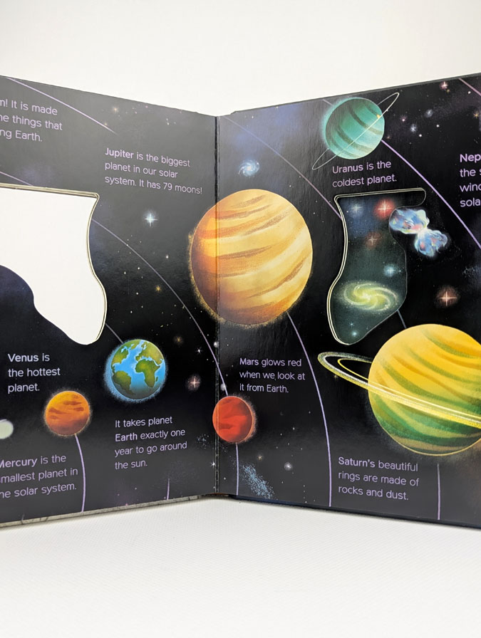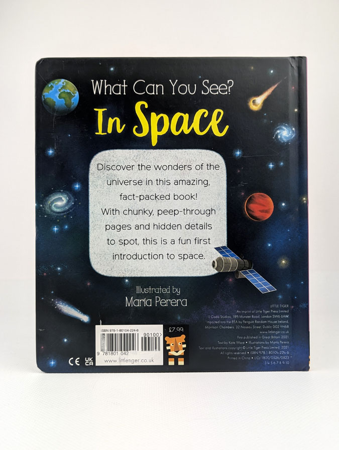 Захоплива книга для наймолодших читачів про космос, планети і Всесвіт. Завдяки міцним сторінкам, простим текстам і віконцям для відкривання діти знайомляться з Сонячною системою, зорями, ракетами та астронавтами. Книга ідеально підходить для спільного читання з батьками та заохочує допитливість через гру і відкриття.